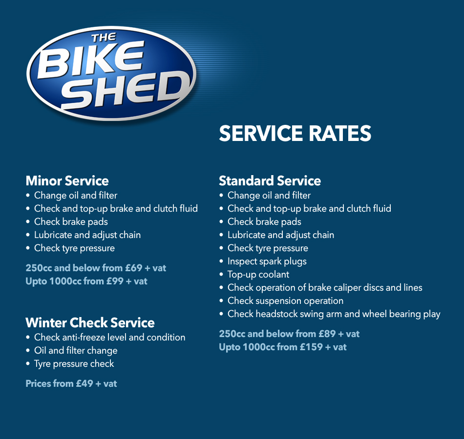 Not only do our qualified mechanics inspect and maintain our bikes to get them to their best condition, they can also take care of yours. We provide a range of servicing from minor servicing and standard servicing to major servicing or just a winter check for bikes upto 1000cc. View service options. We also offer tyre fiiting and ultrasonic cleaning plus lots more.